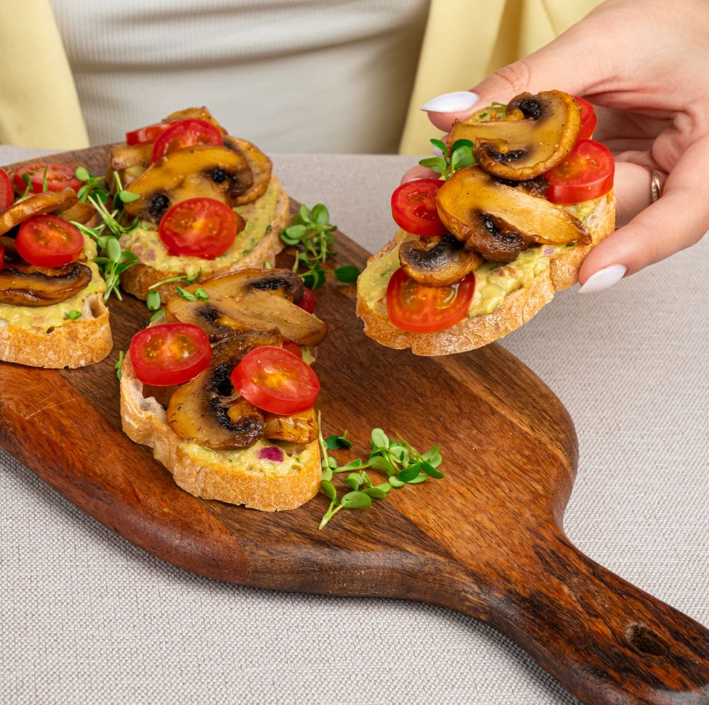 тост, гуакомоле из авокадо, обжаренные шампиньоны, помидоры черри