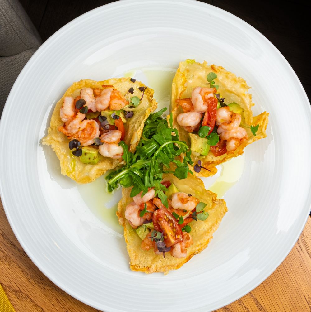корзинка из сыра пармезан, креветки, авокадо, помидоры черри