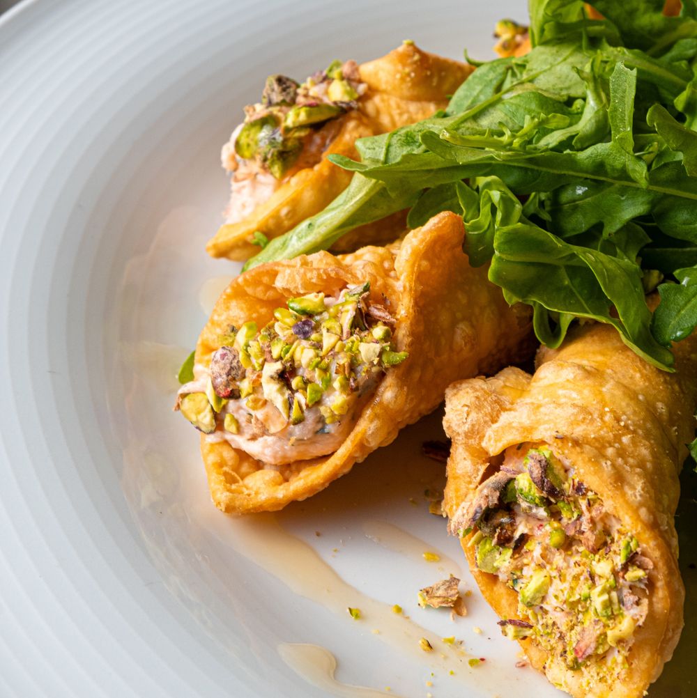 слоеное тесто, риет из лосося с сыром маскарпоне, фисташка