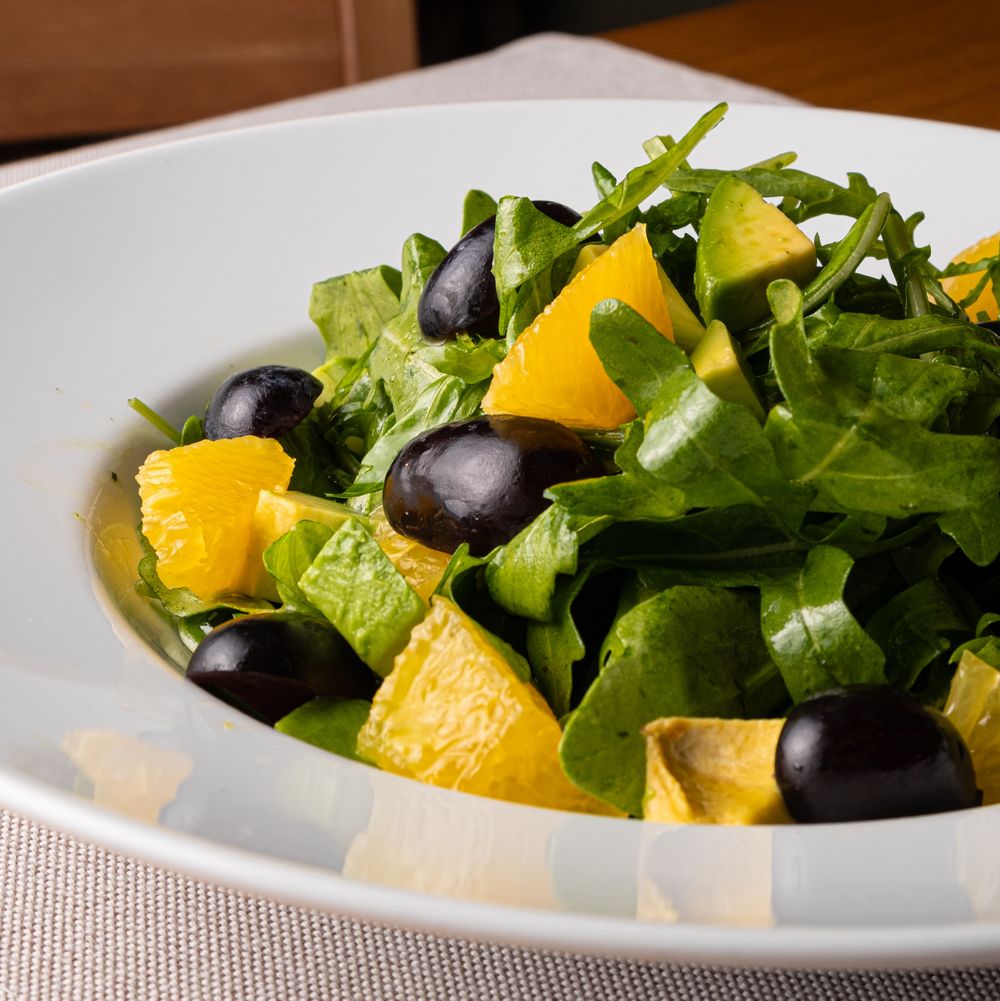 Рукола, апельсин, виноград, авокадо, салатная заправка