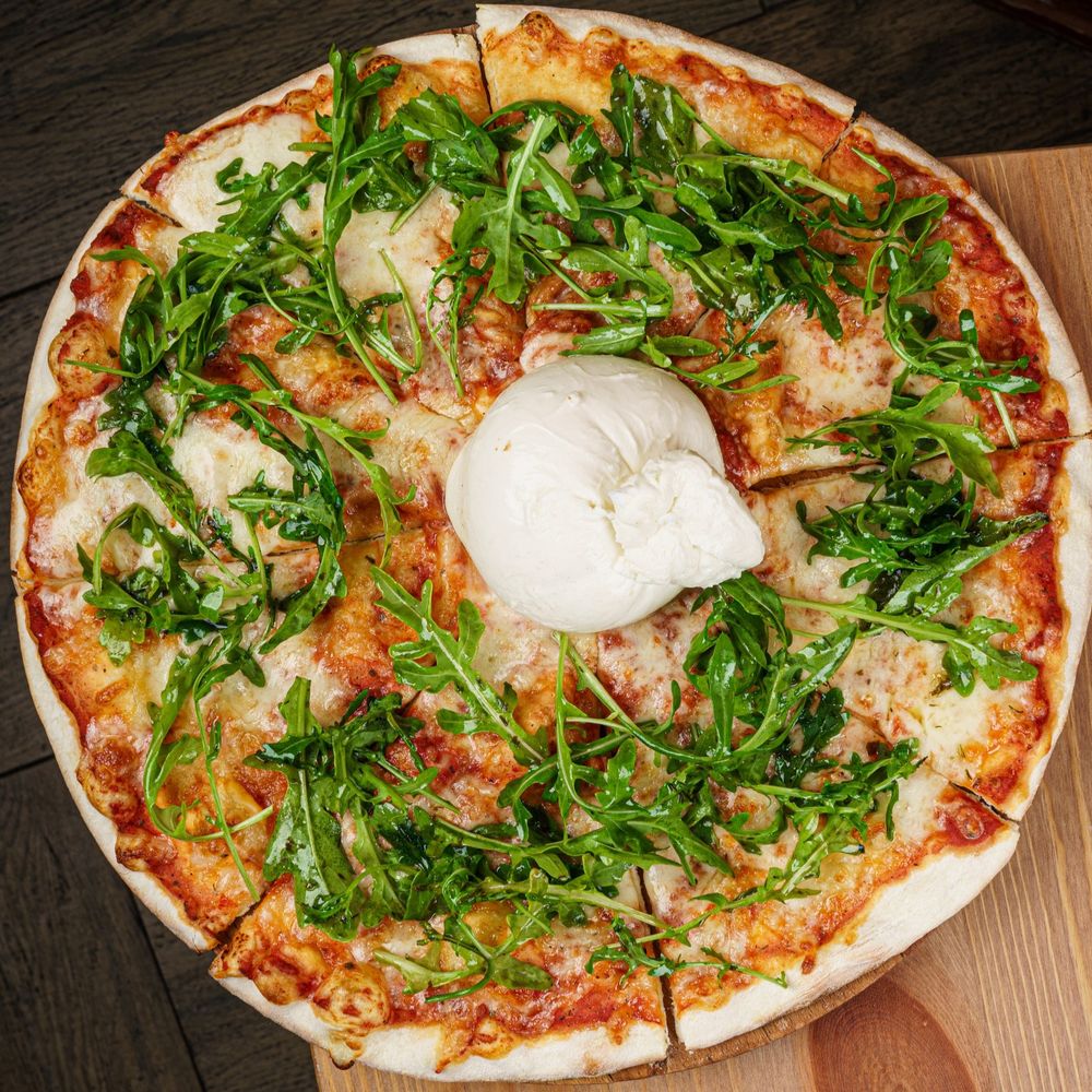 Соус томатный, сыр моцарелла, сыр буррата, рукола
