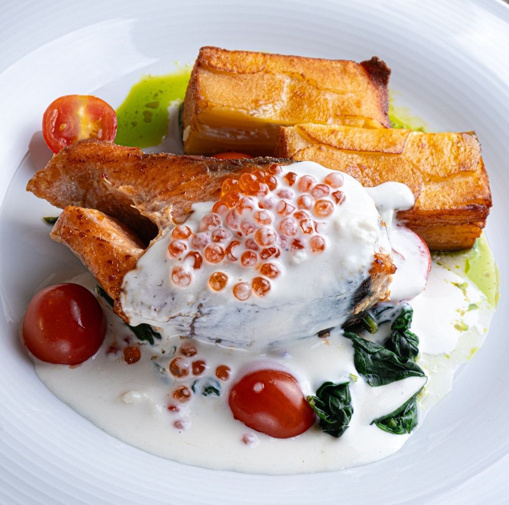 Форель (морская), шпинат, черри, сливочно-икорный соус, картофельный гратен