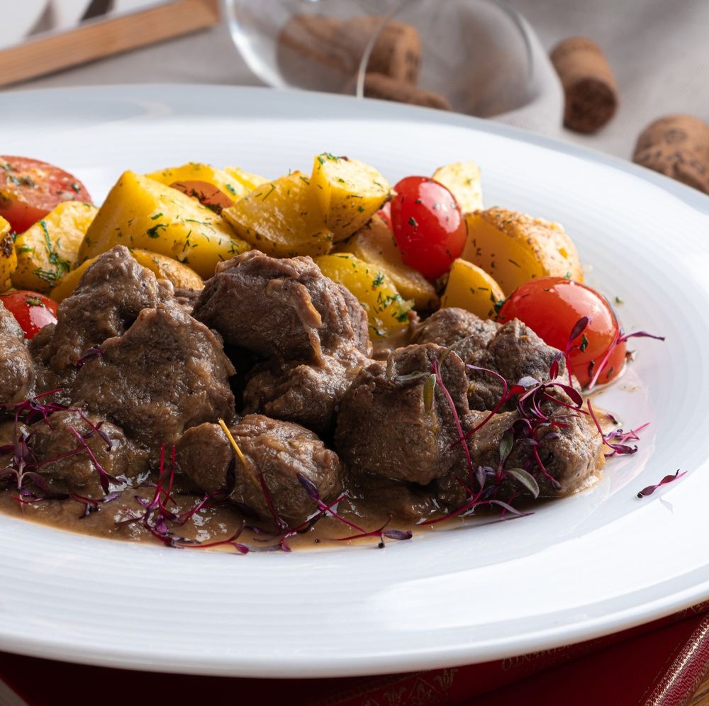 Томленое филе баранины, картофель запеченный с помидорами черри, кинзой и укропом