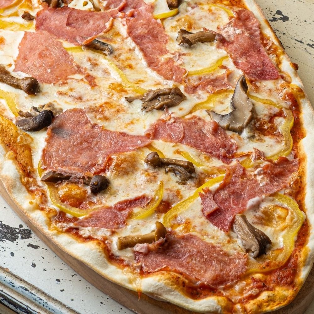 Прошутто котто, болгарский перец, ассорти из грибов Пицца доступна в двух размерах: большая 60 см и маленькая 40 см Выбирите свой вариант