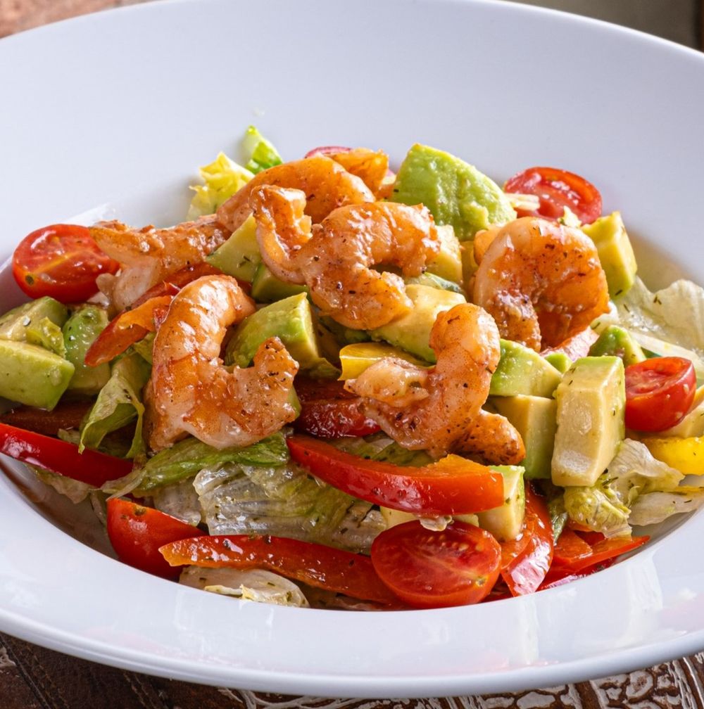 Салат айсберг, креветки тигровые, авокадо, помидоры черри, болгарский перец, салатная заправка