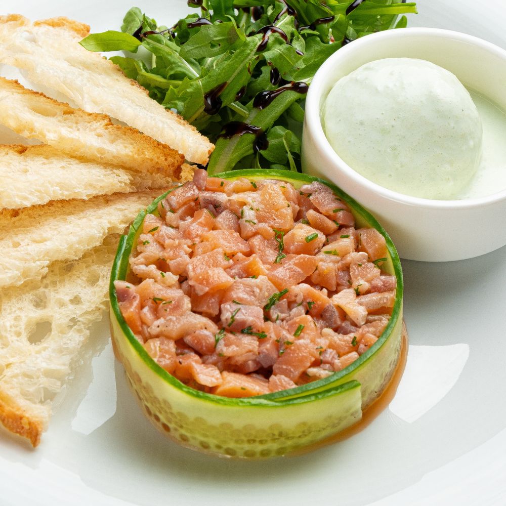 свежий лосось, маринованный лосось, мороженое васаби, огурец, гренки