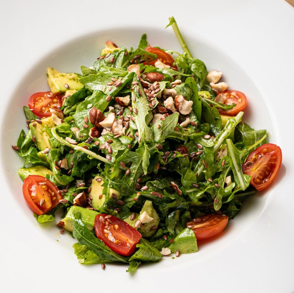 Рукола, помидоры черри, фундук, семя льна, салатная заправка.
