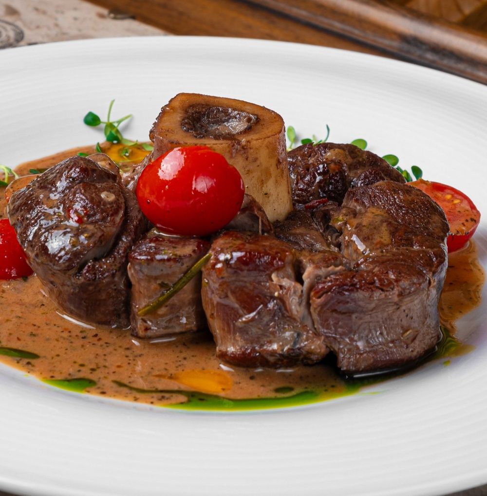 Томленая телячья голень с соусом бер-блан, томатами черри и тосканскими травами