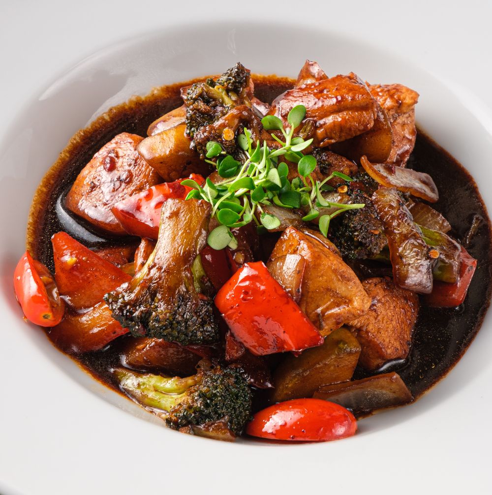 томленное филе курной грудки с брокколи, болгарским перецем, цукини, черри, репчатым луком и чесноком в соусе сладкий чилли, соевом соусе и бальзамическом уксусе