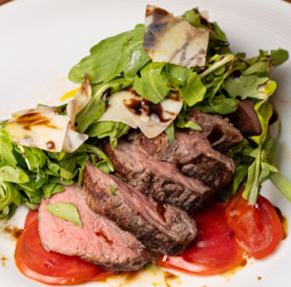 Вырезка телятины, рукола, сыр пармезан, помидоры, бальзамический соус