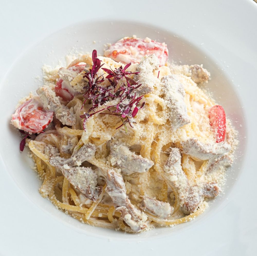 Сливки, вырезка телятины, лук репчатый, чеснок, помидоры черри, сыр пармезан Подберите вид пасты по вашему вкусу