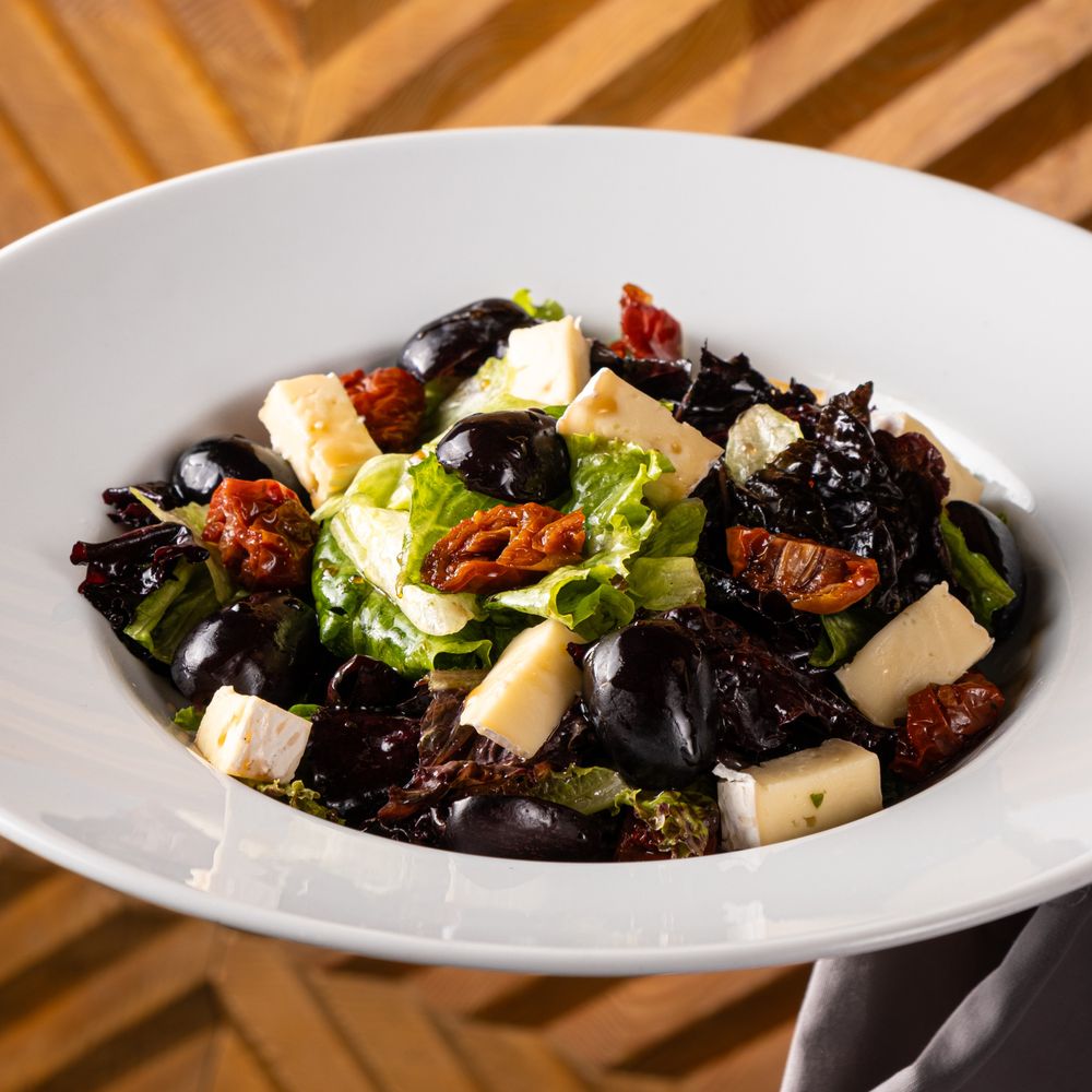 Микс салат, вяленые томаты, виноград, сыр бри, гранатовый соус