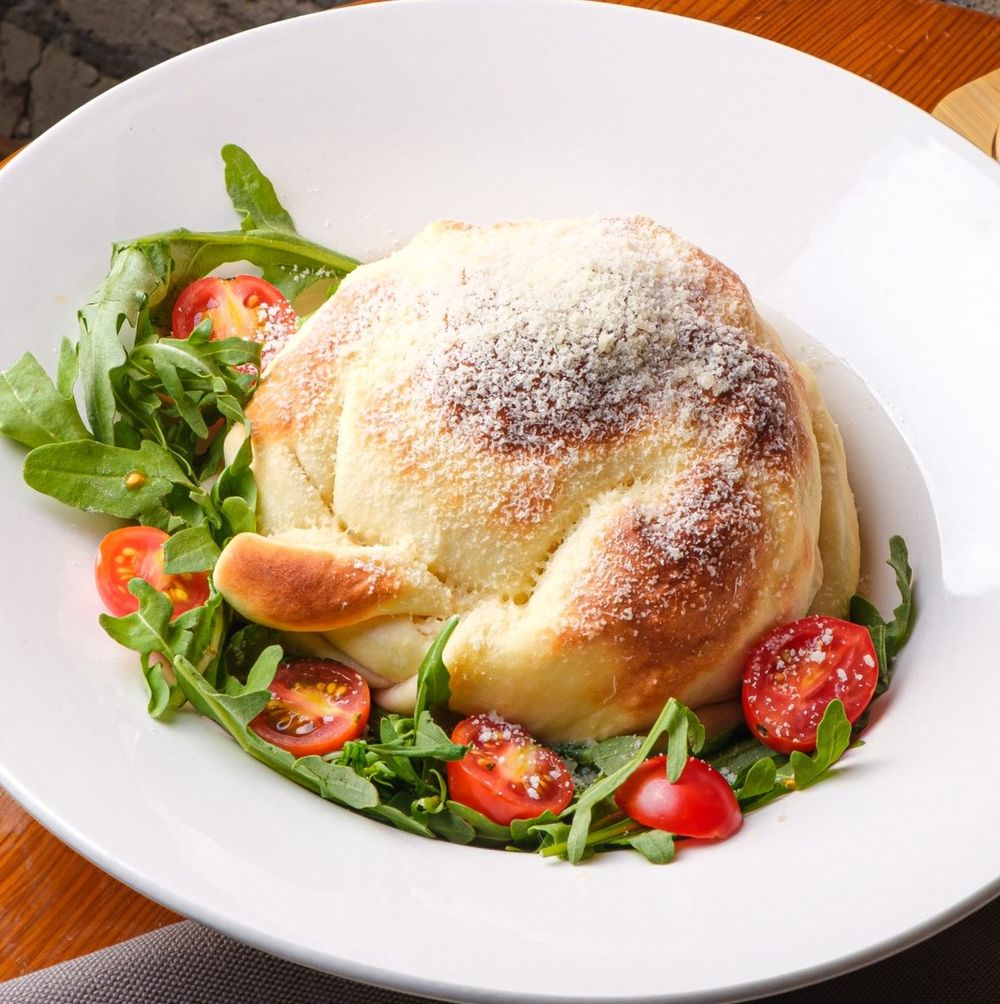 Паста люмакони с куриным филе, цукини и сливочным соусом запеченная в тесте, помидоры черри, рукола
