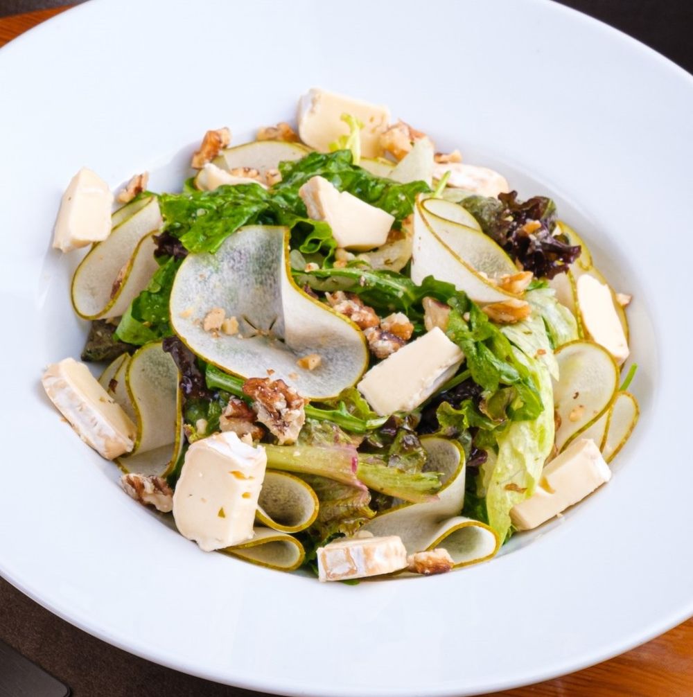 Микс салат, груша, сыр бри, рукола, грецкий орех, салатная заправка