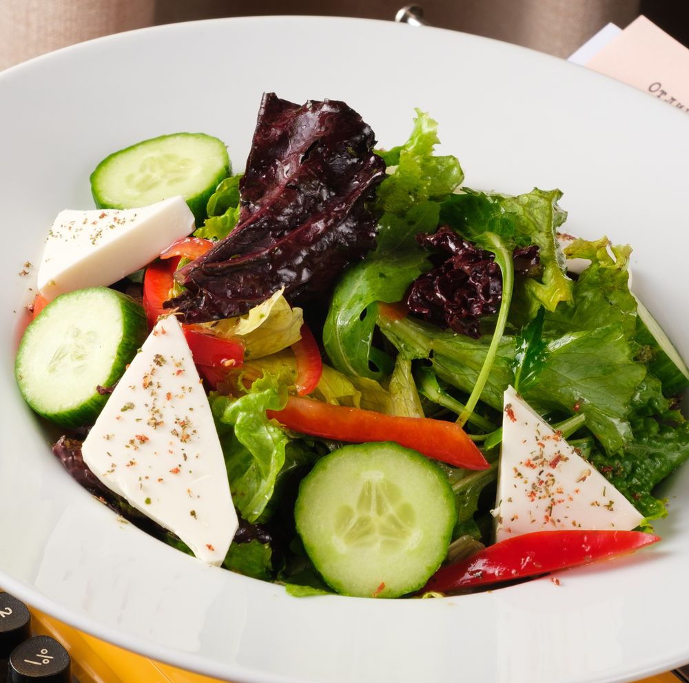 Микс салат, огурец, помидор, перец боргарский, оливки, сыр фетакса, салатная заправка