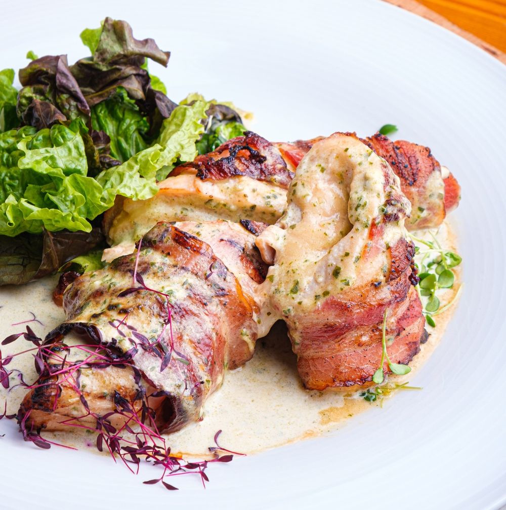 Куриное филе фаршерованное сыром моцарелла, обернутое свиным беконом со сливочным соусом и песто