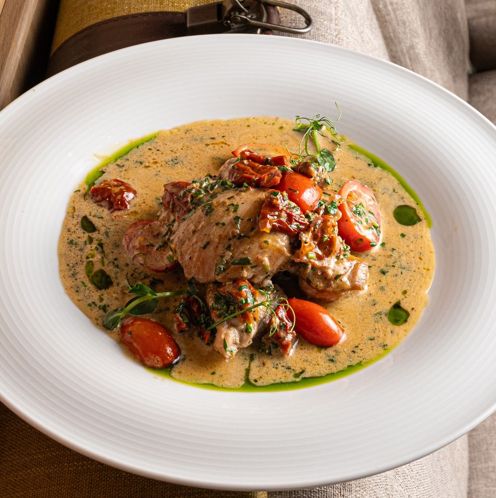 Куриное бедро, вяленые томаты, томаты черри, чеснок, соус бер-блан, петрушка
