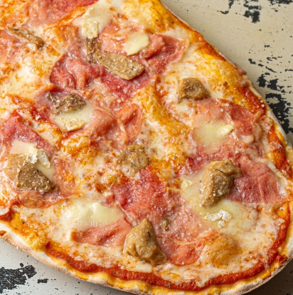 Прошутто котто, белый гриб, сыр бри, сыр пармезан Пицца доступна в двух размерах: большая 60 см и маленькая 40 см Выбирите свой вариант