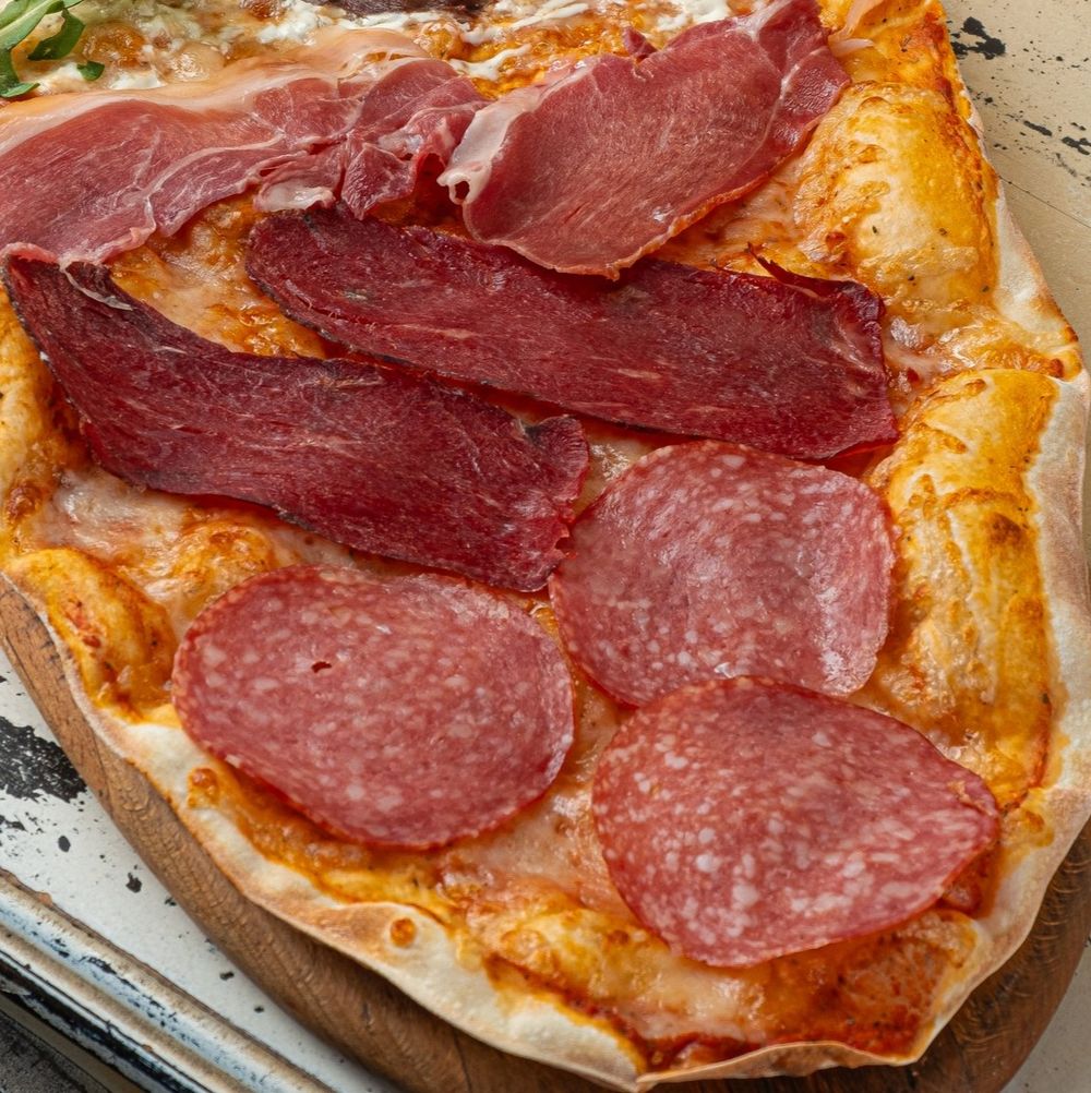 Прошутто крудо, бреозола из конины, салями милано Пицца доступна в двух размерах: большая 60 см и маленькая 40 см Выбирите свой вариант