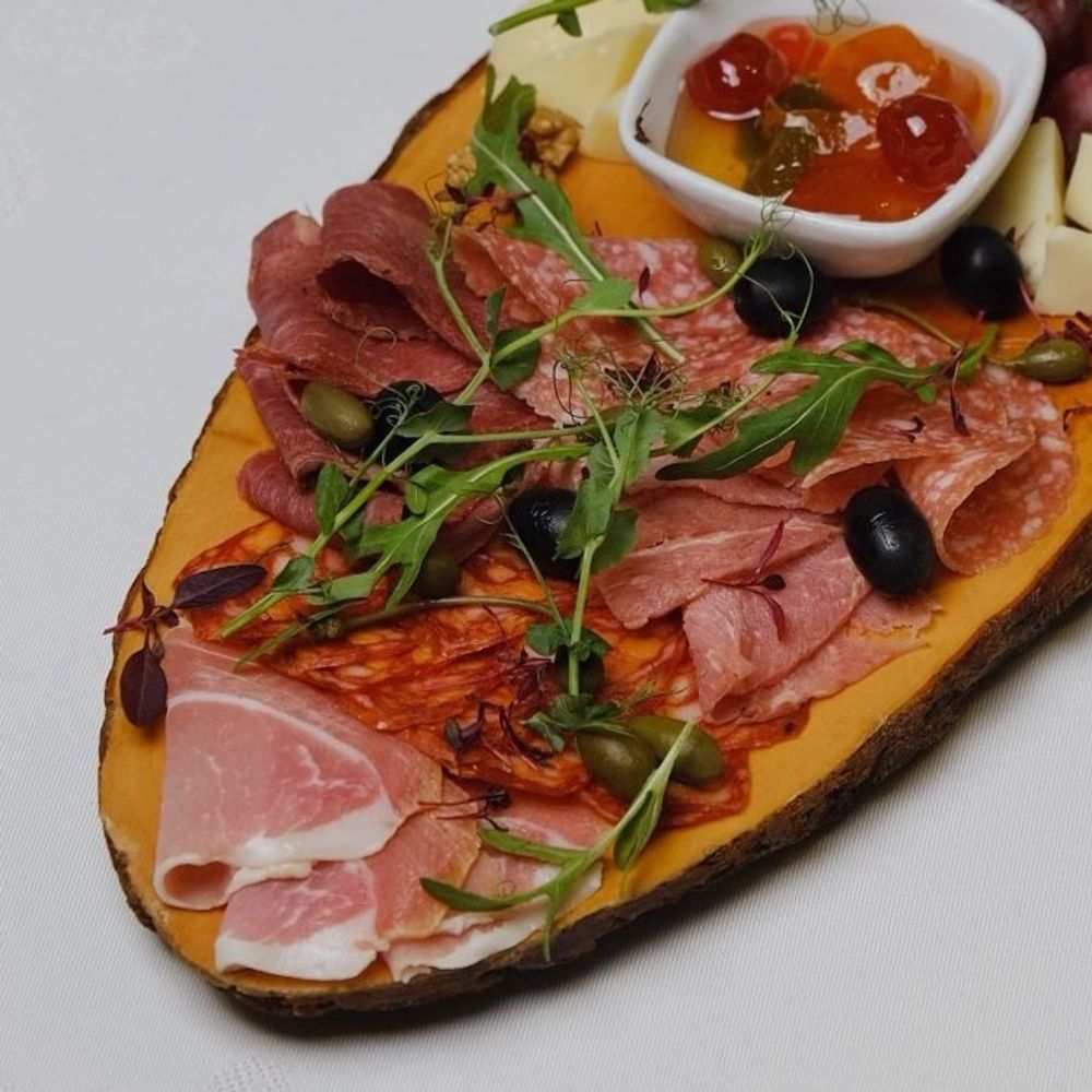 прошутто крудо, прошутто котто, брезаола из конины, острая сальсича, салями милано, маслины и каперсы