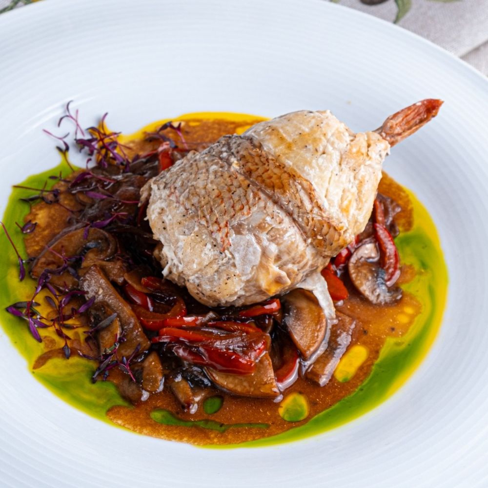 Морской окунь, креветка, нори, болгарский перец, шампиньоны, красный лук, устрично-соевый соус