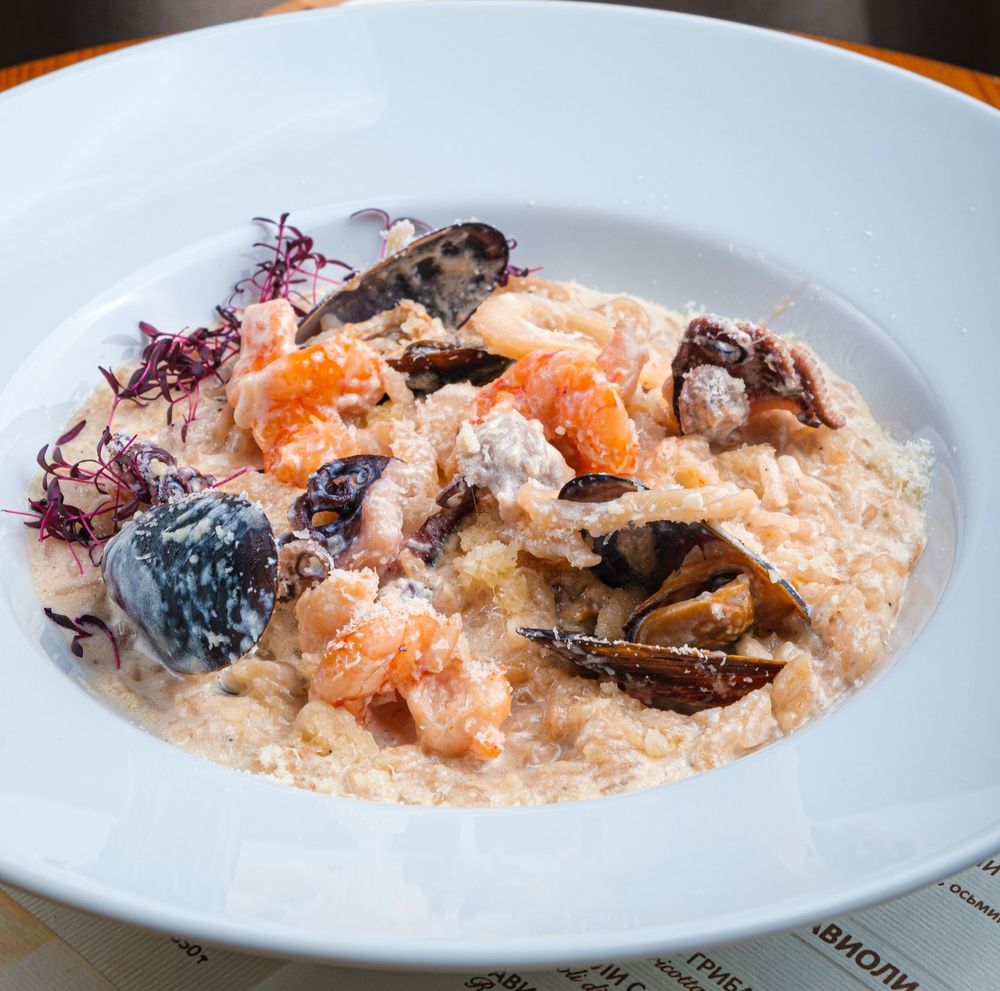 рис арборио, креветки тигровые, осьминоги, кальмары, мидии, лук репчатый, сливки, сыр пармезан