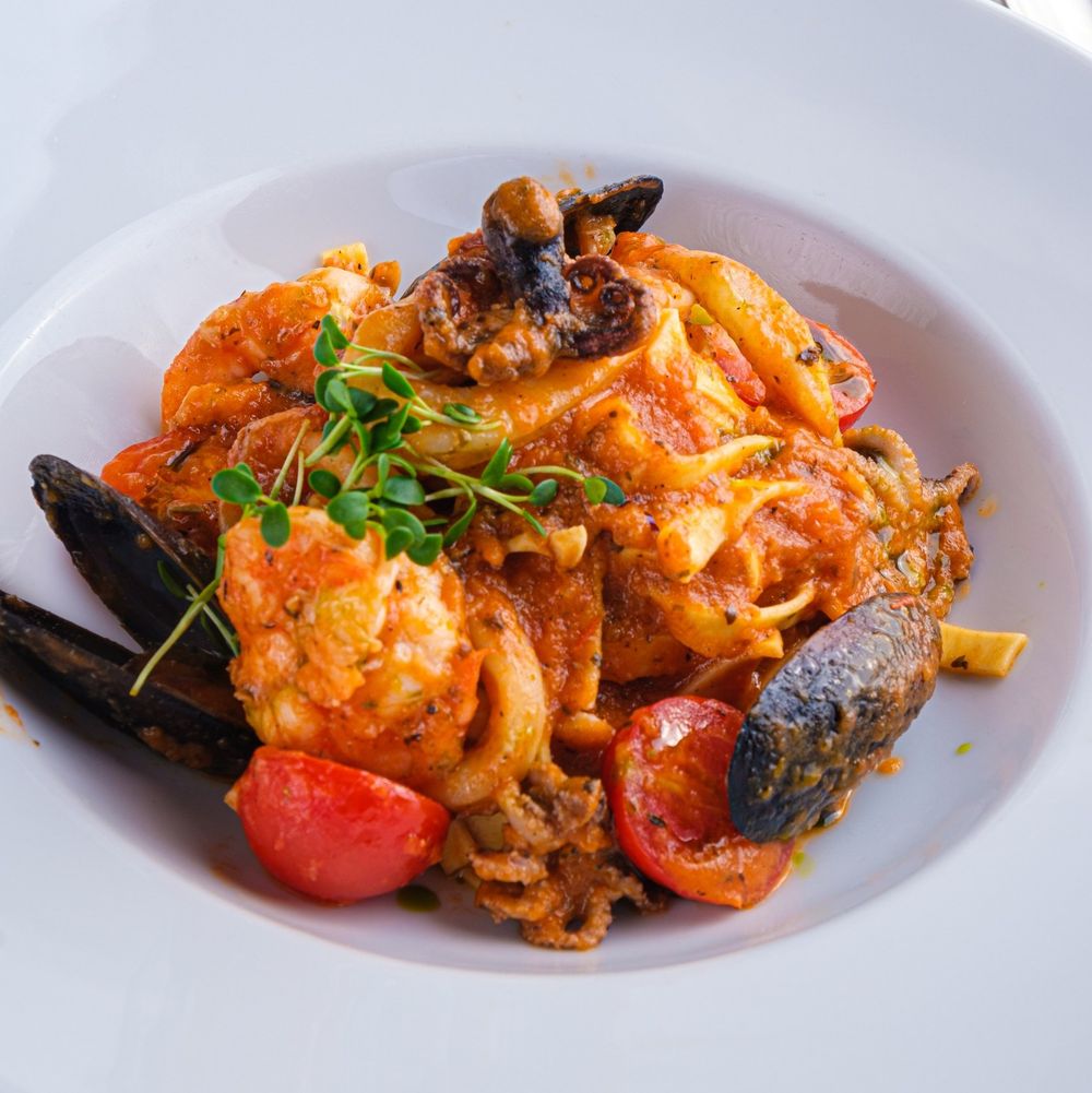 Томатный соус, осьминоги, кальмары, креветки тигровые, мидии, помидоры черри Подберите вид пасты по вашему вкусу