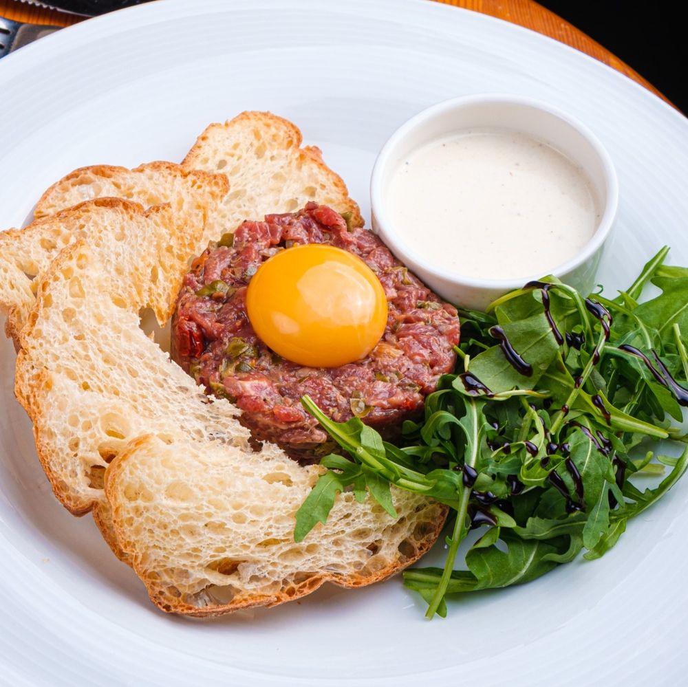 свежее мясо телятины, красный лук, каперсы, сливочно-трюфельный соус, вяленые томаты, соус тобаско, специи, желток, гренки