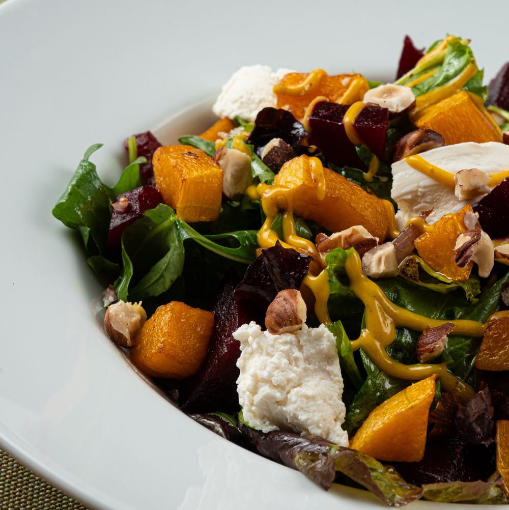 Микс салат, рукола, свекла, тыква, фундук, сыр рикотта, сладкая горчица, салатная заправка