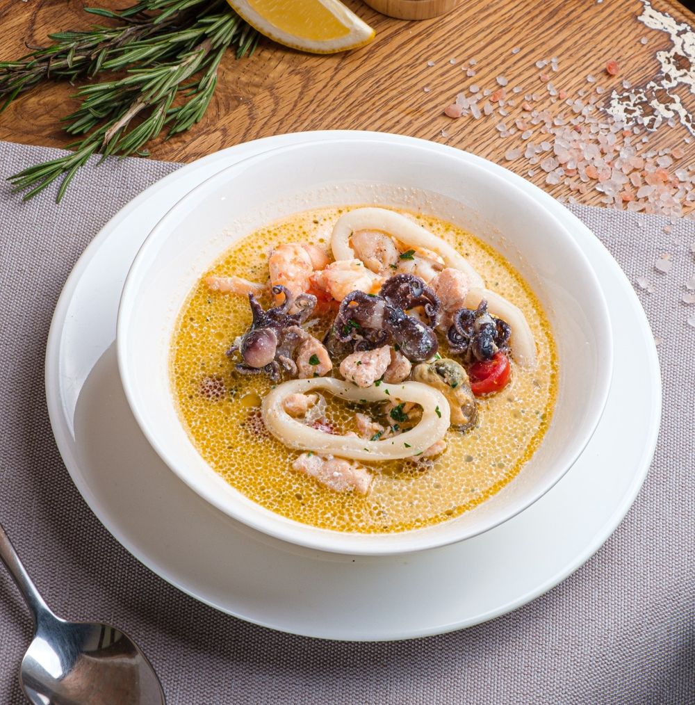 Креветки, лосось, кальмары, осьминоги, мидии, соус песто, черри, сливки