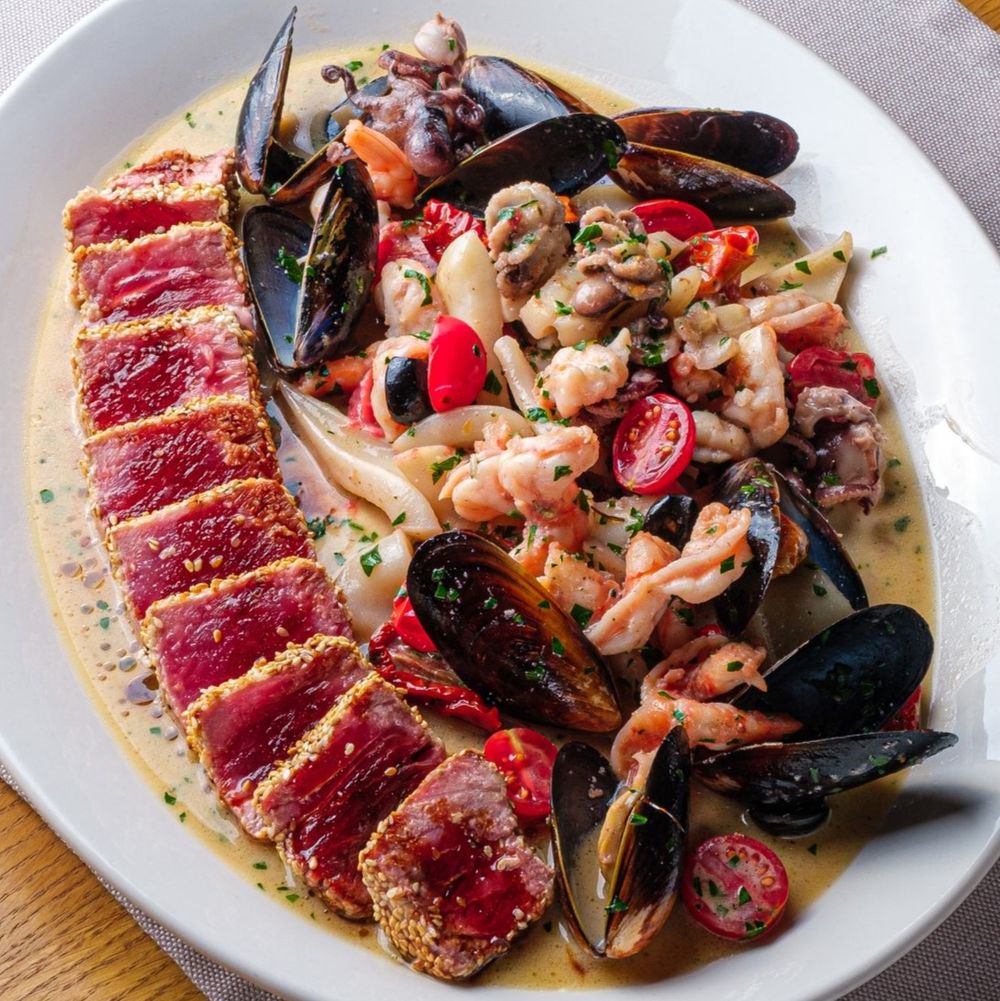 Опаленный тунец, креветки, мидии, кальмар, осьминог, чеснок, соус из белого вина