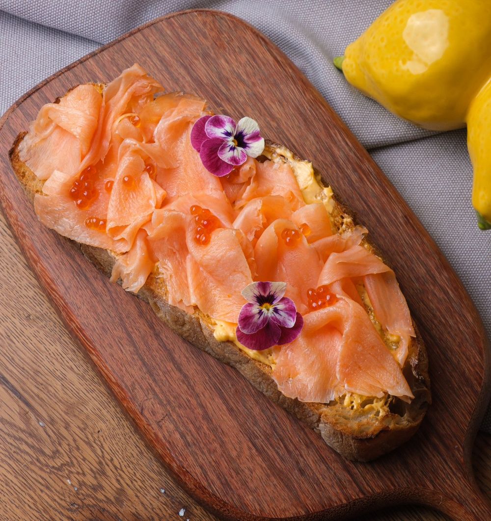 тост, филе лосося маринованного, огурец, сыр рикотта, чеснок, зелень