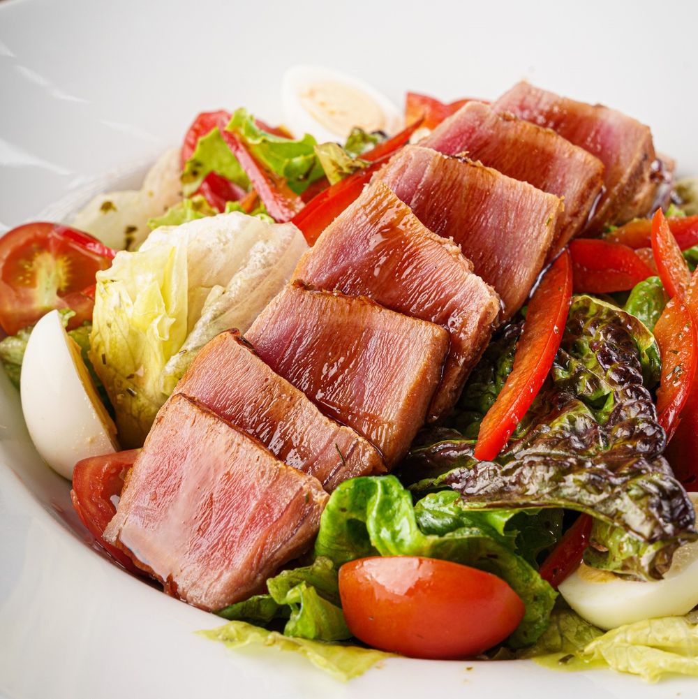 Микс салат, тунец опаленный, сладкий перец, помидоры черри, перепелиное яйцо, салатная заправка